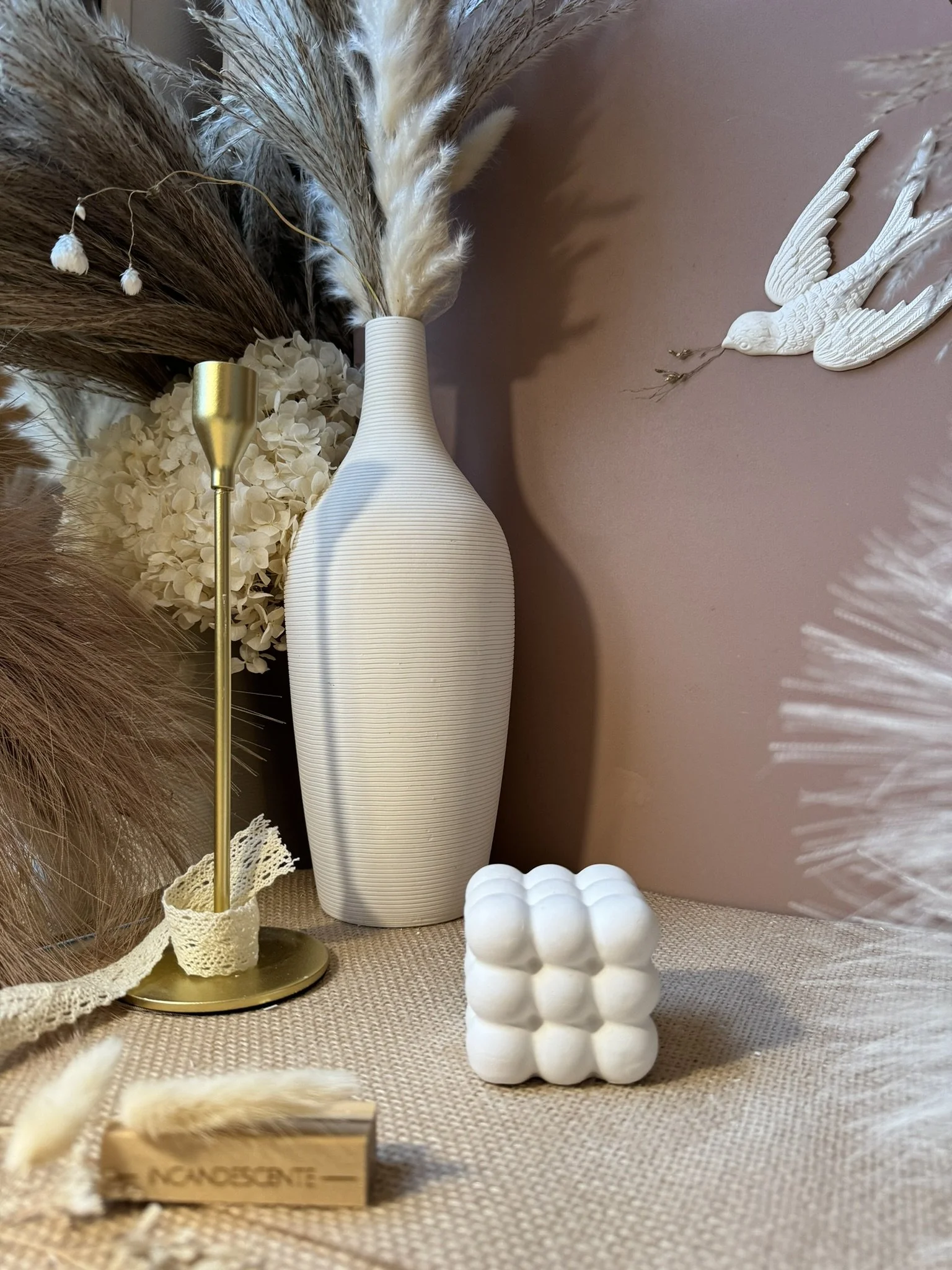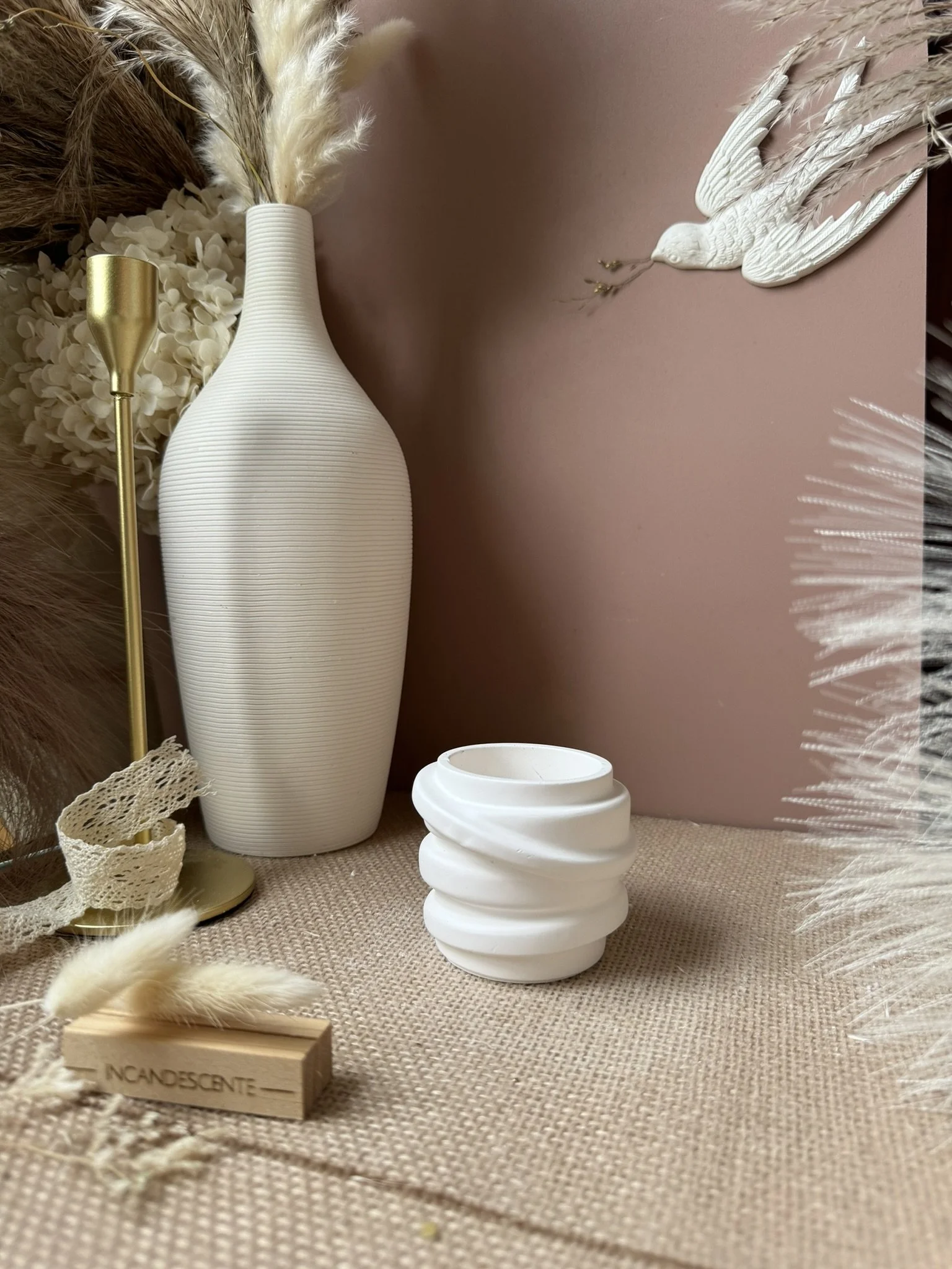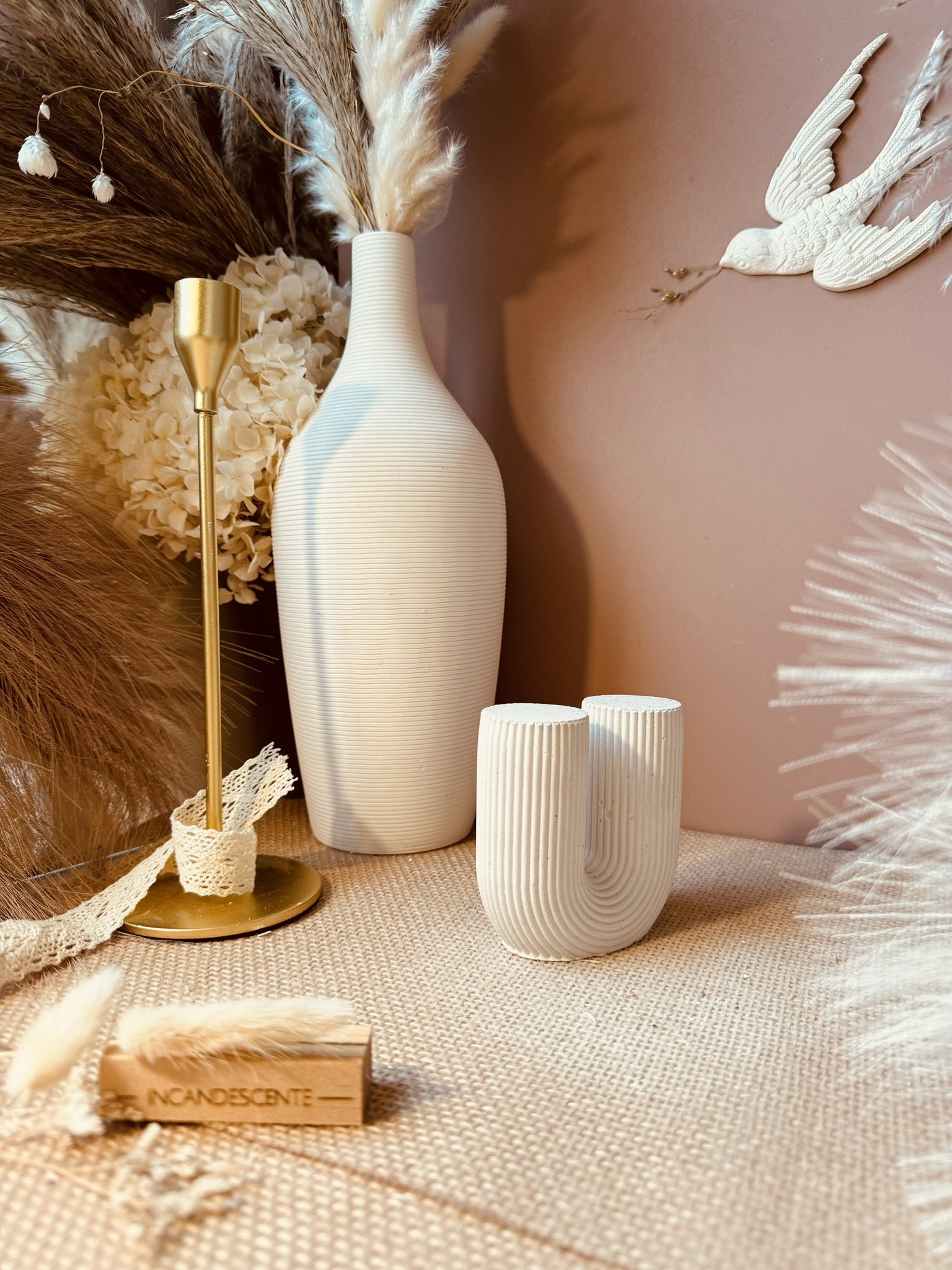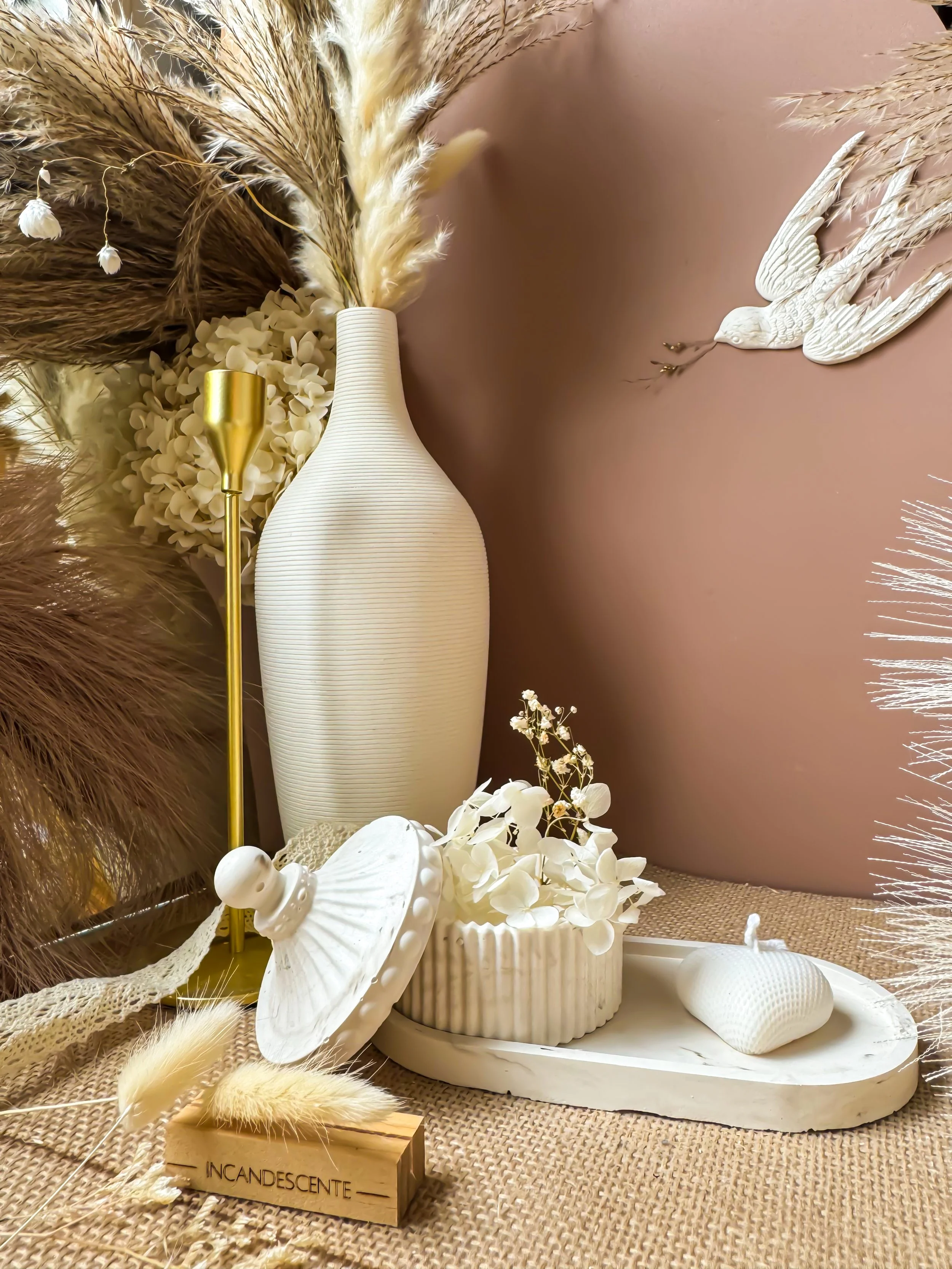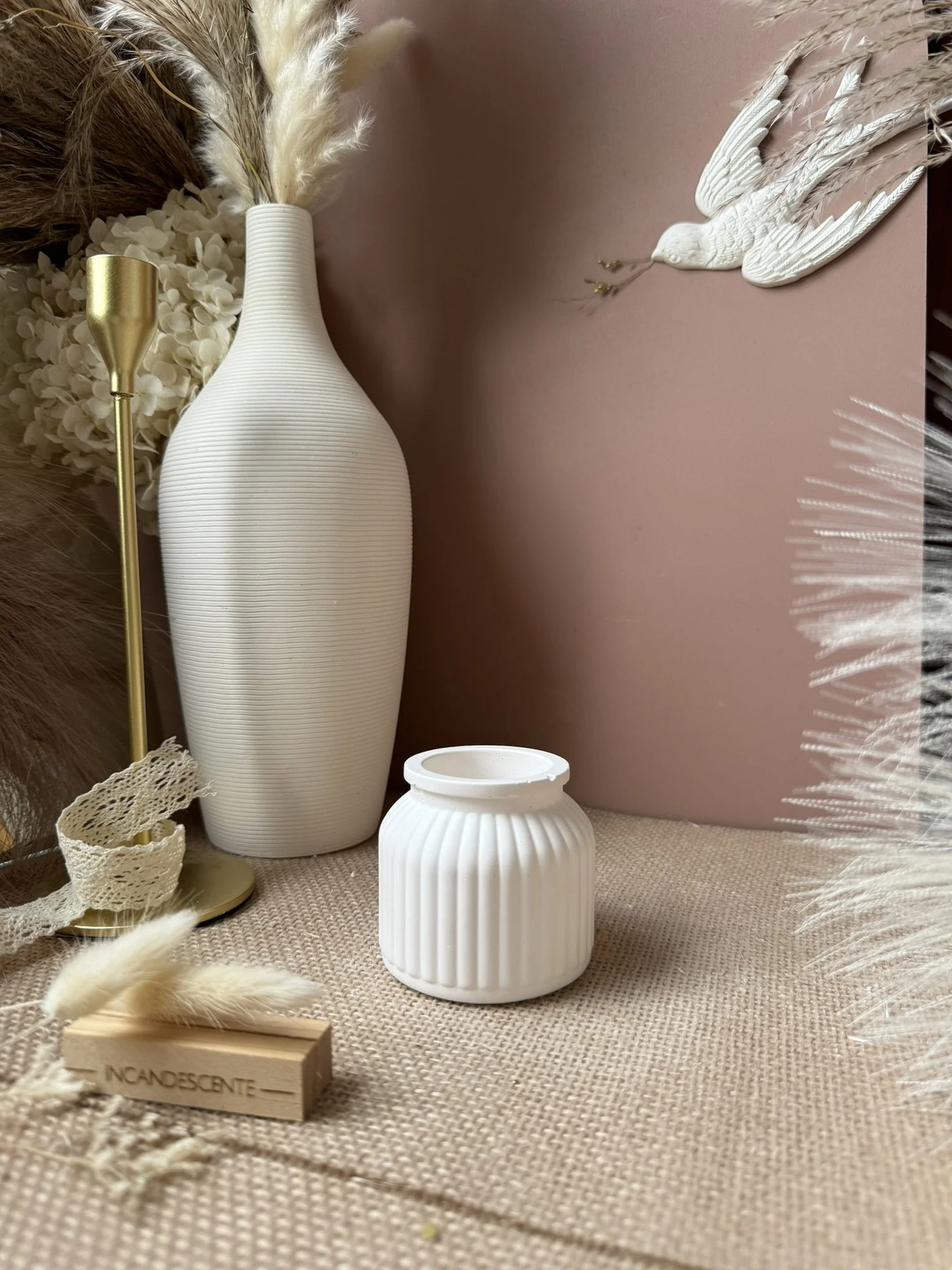 Petit pot rayures verticales bougie ou vase avec fleurs séchées en plâtre