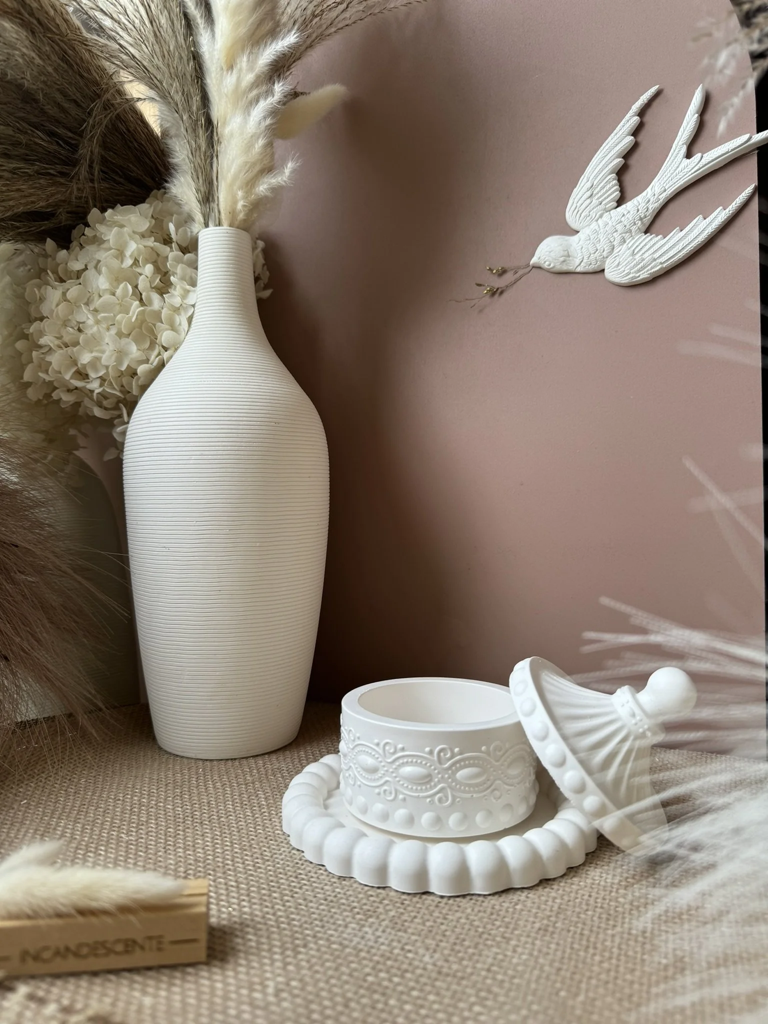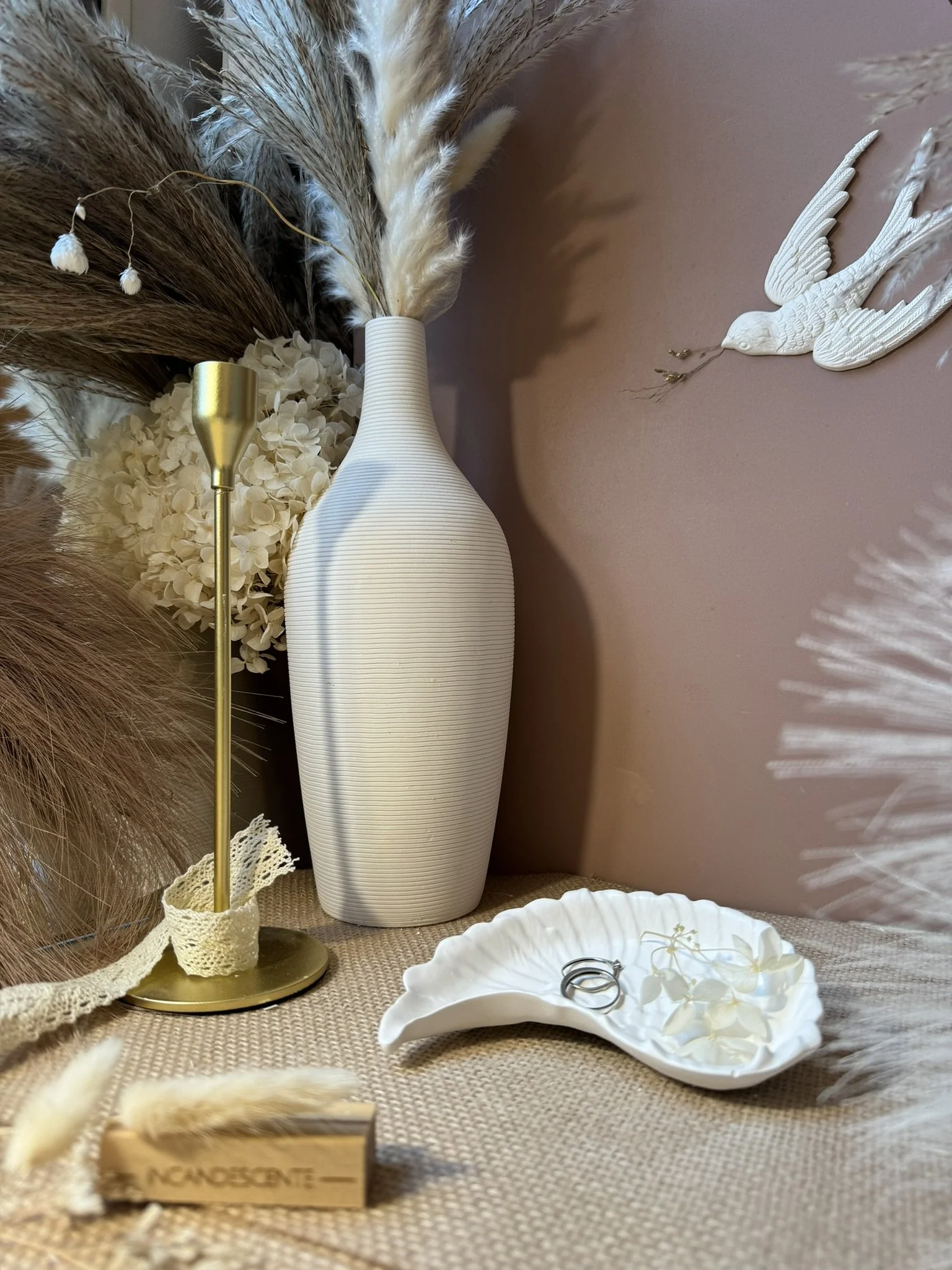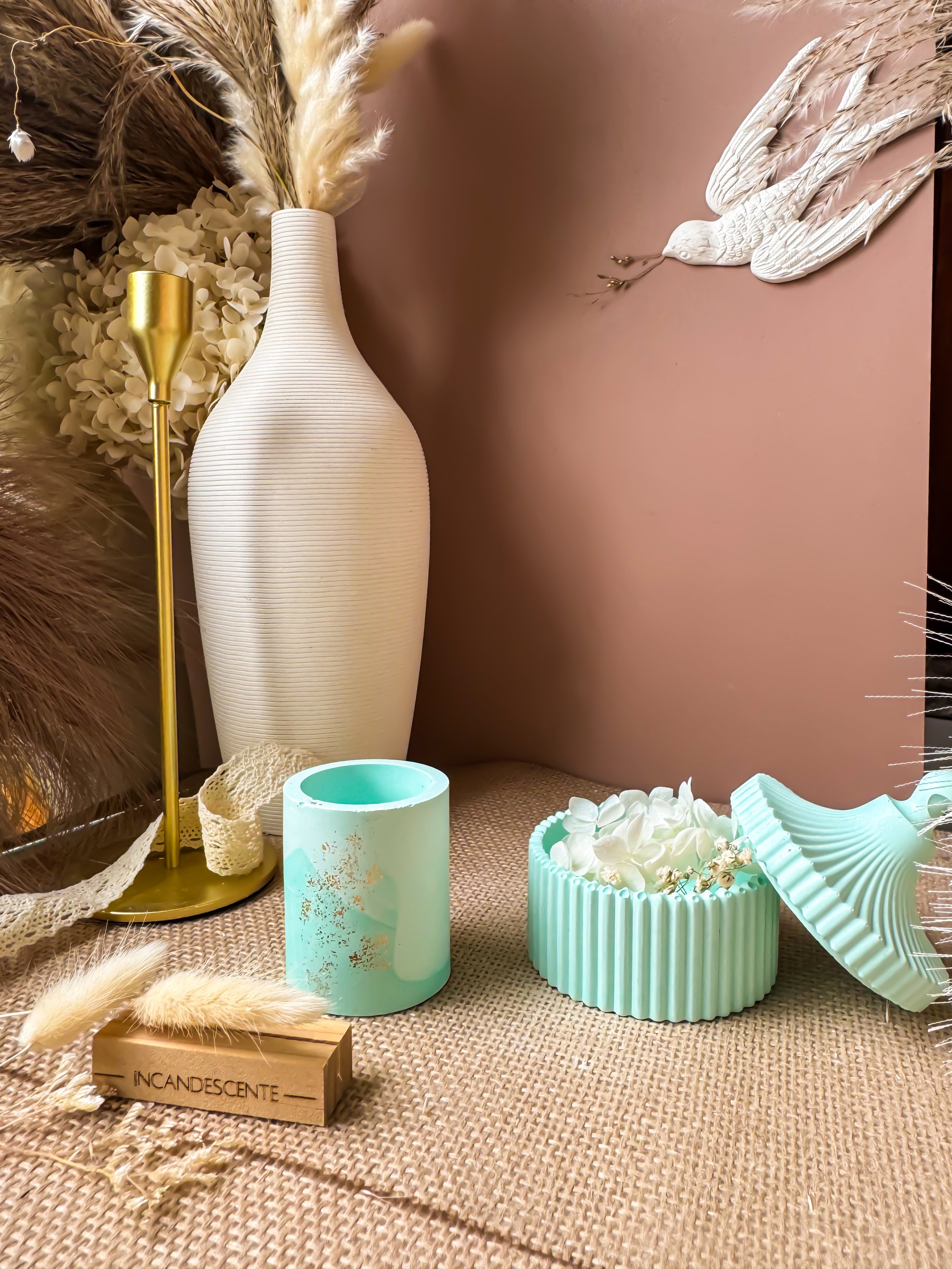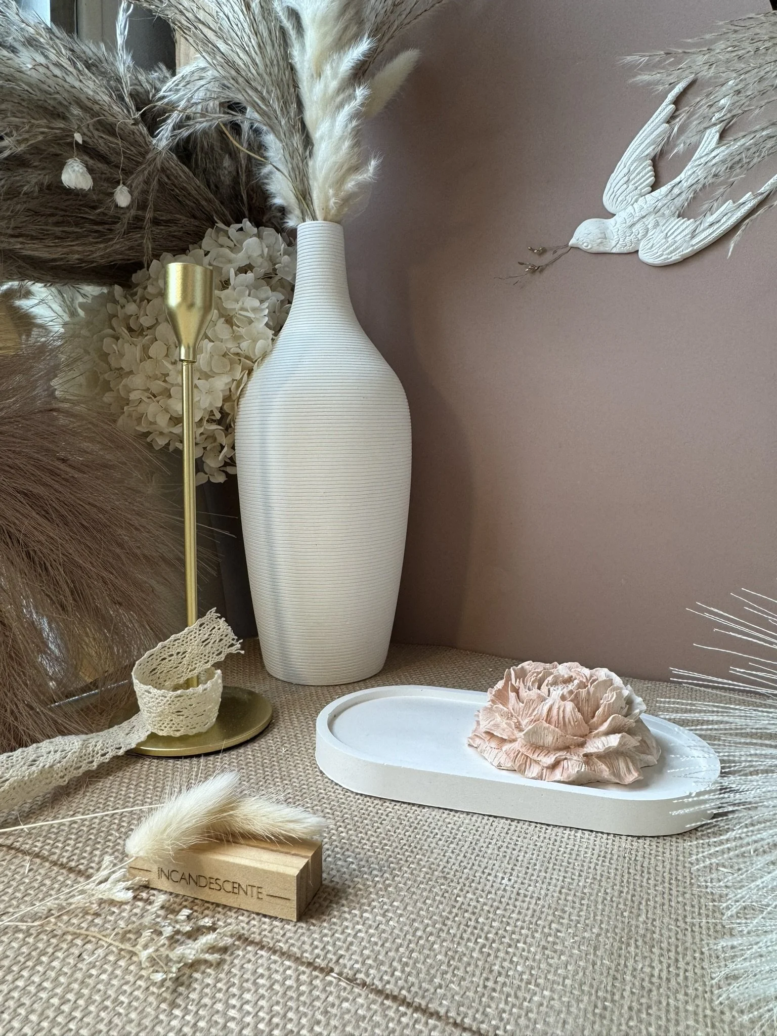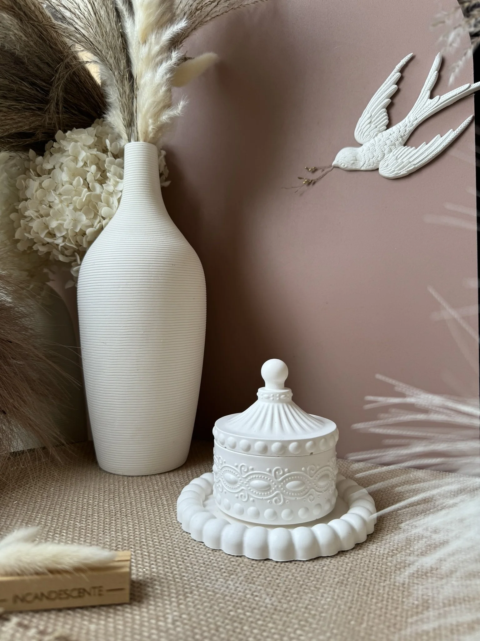 Petit pot rayures verticales bougie ou vase avec fleurs séchées en plâtre