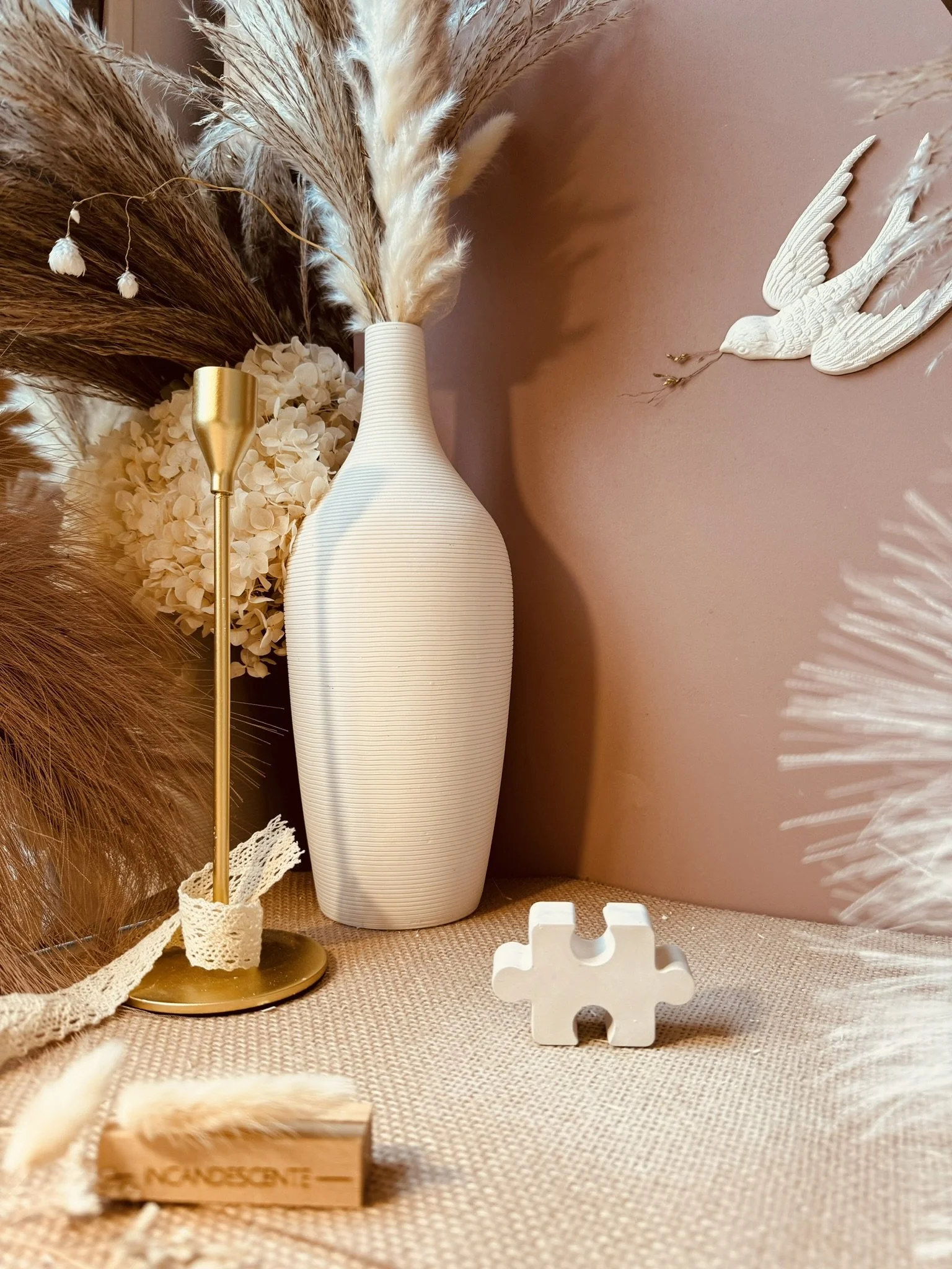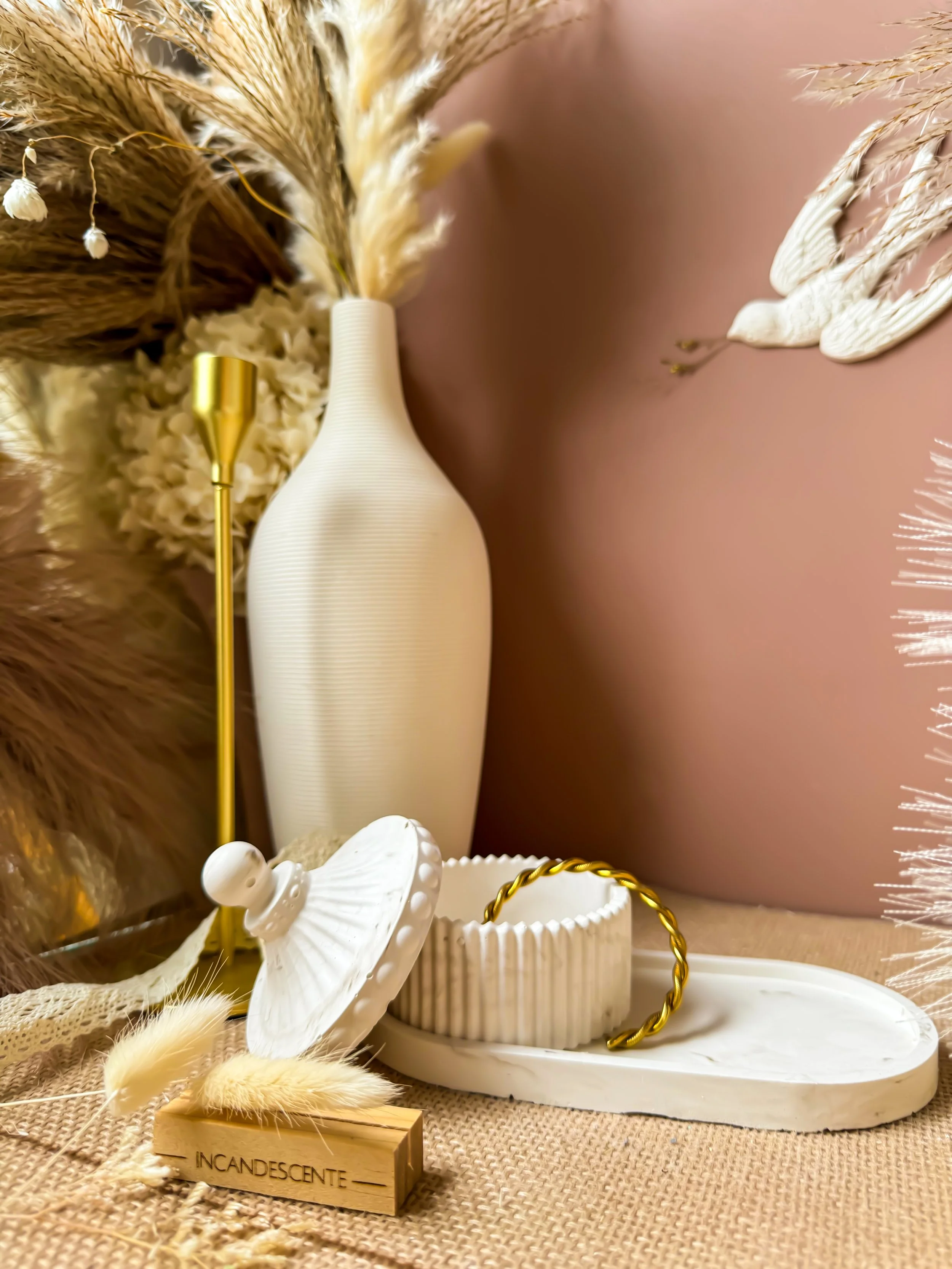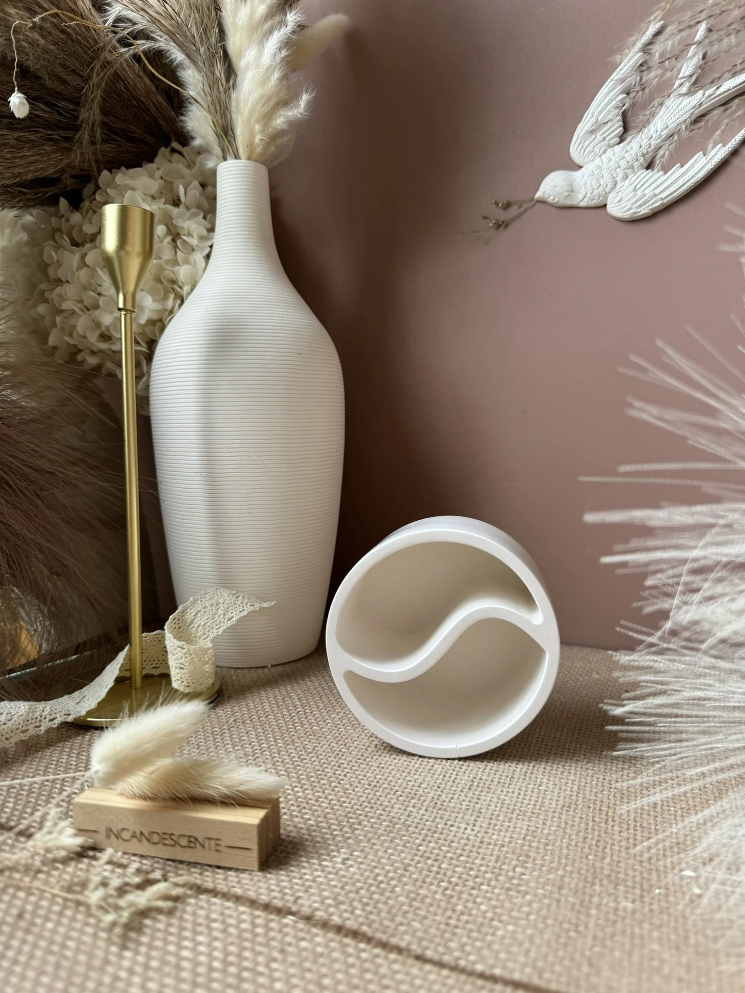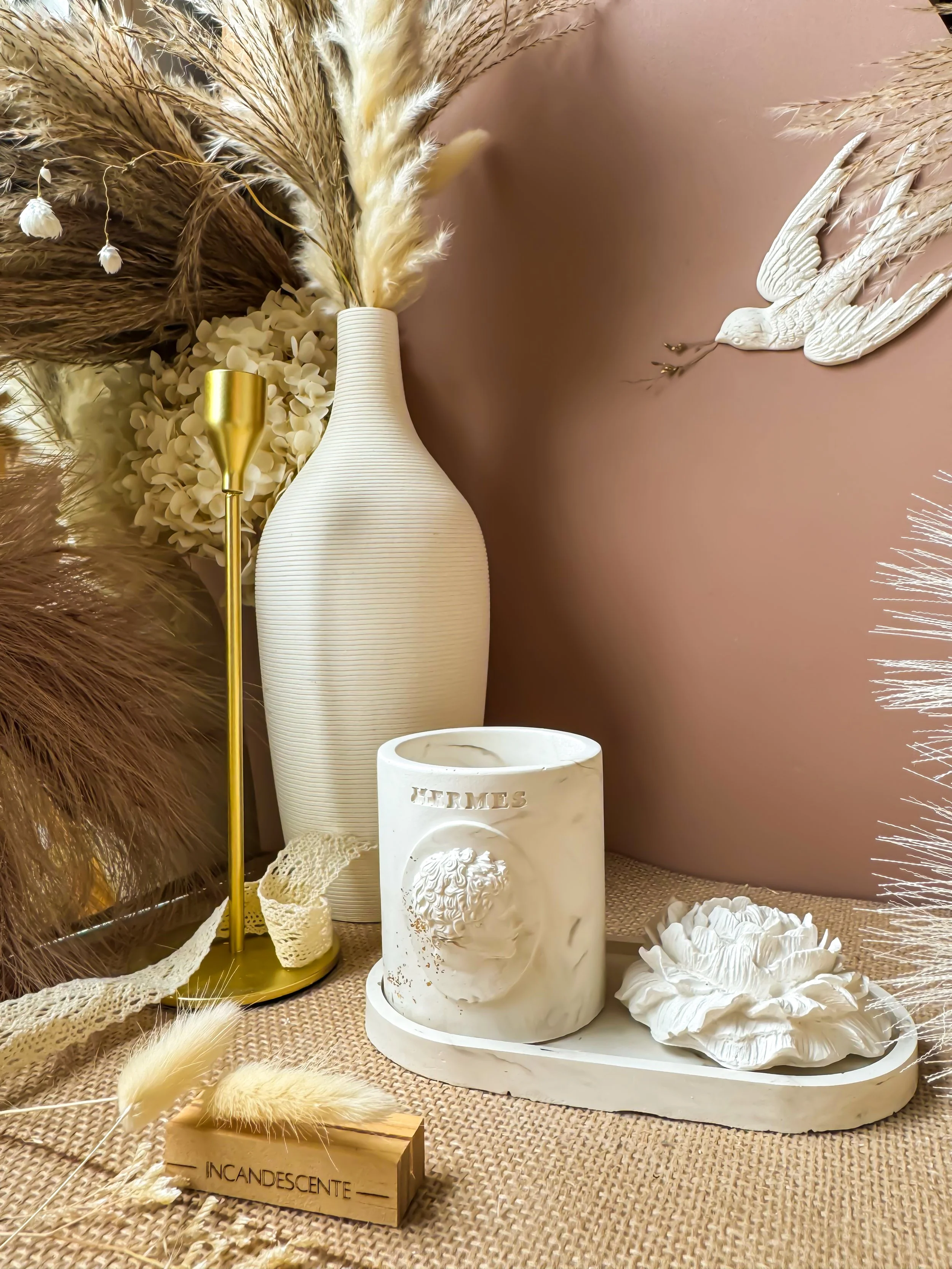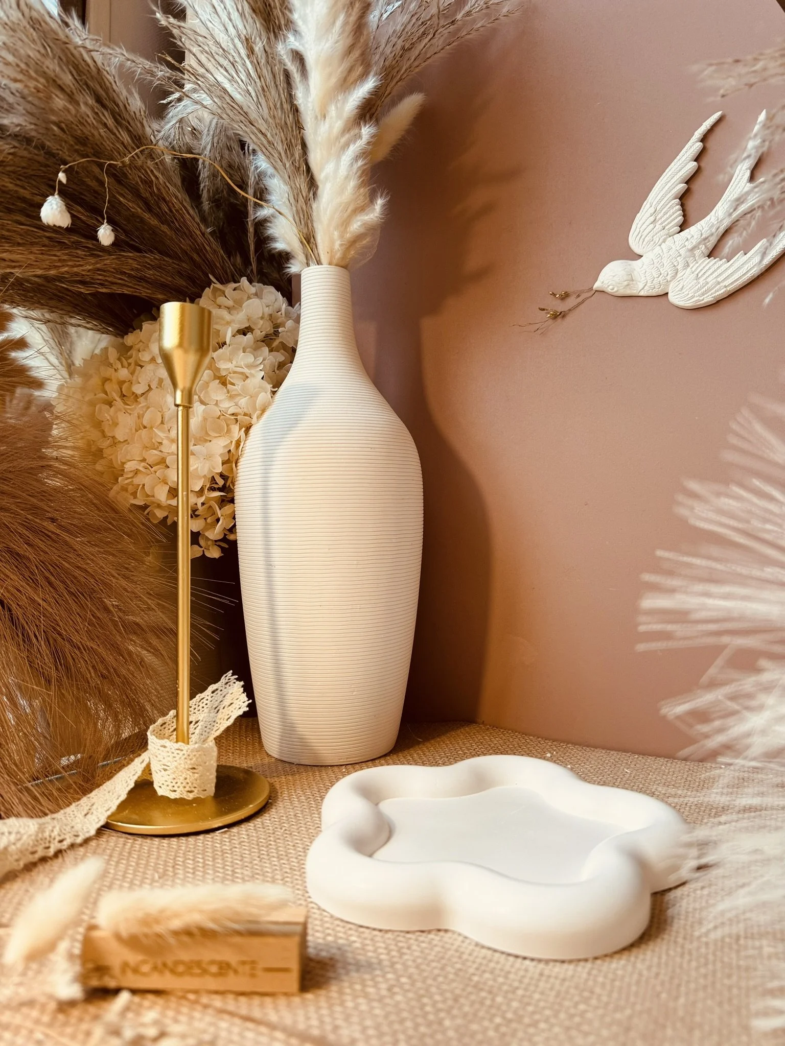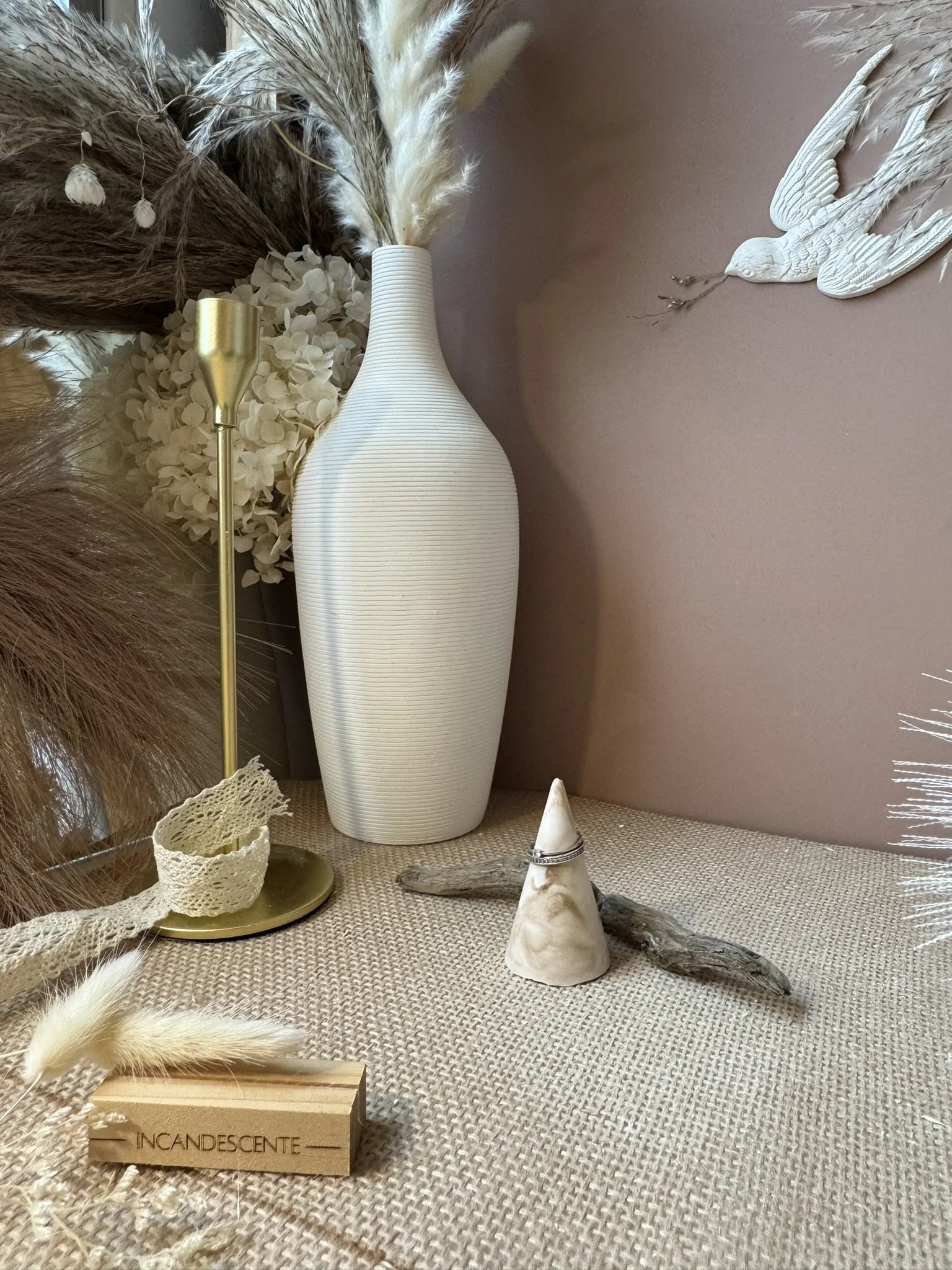 Petit pot rayures verticales bougie ou vase avec fleurs séchées en plâtre