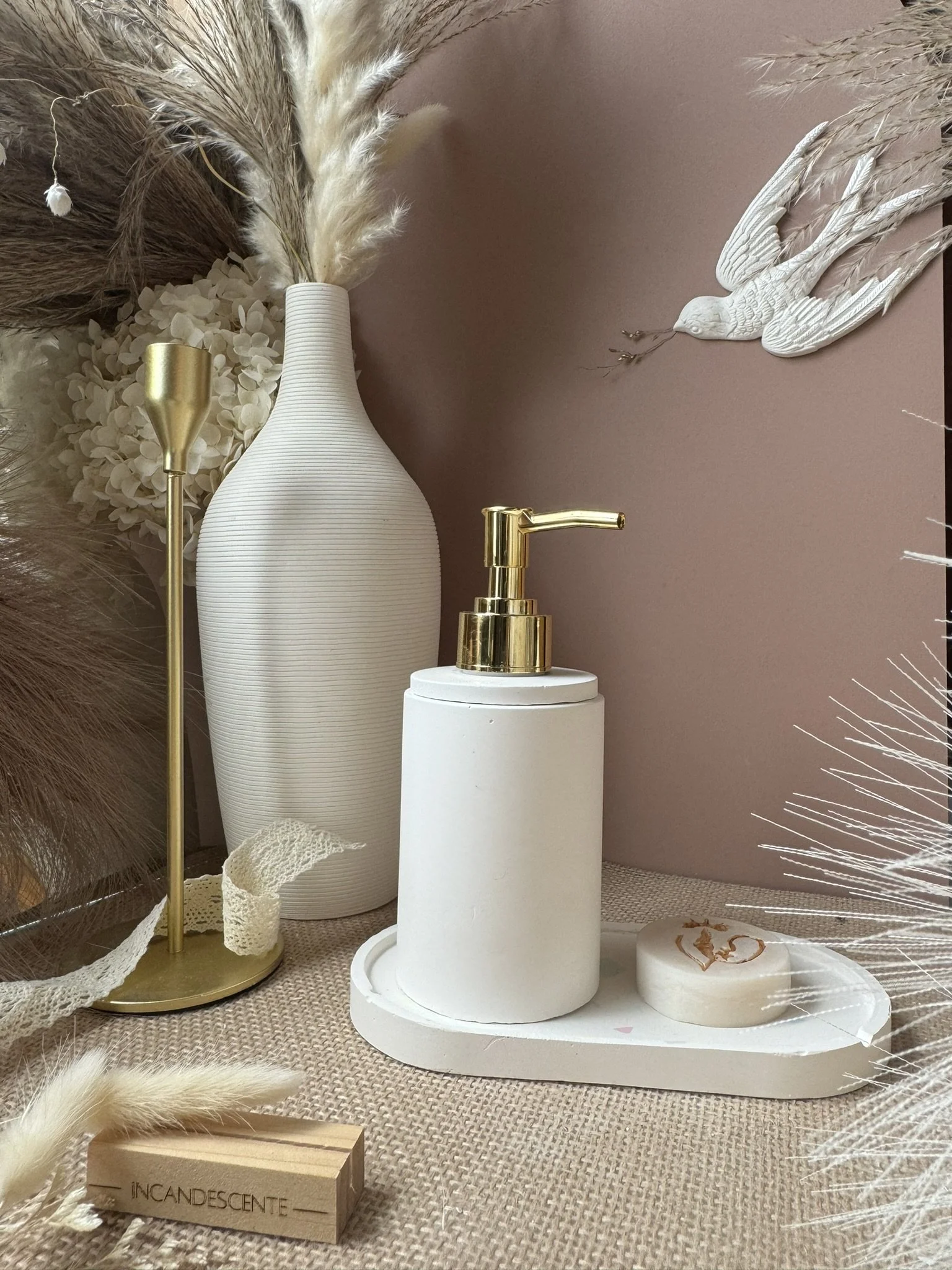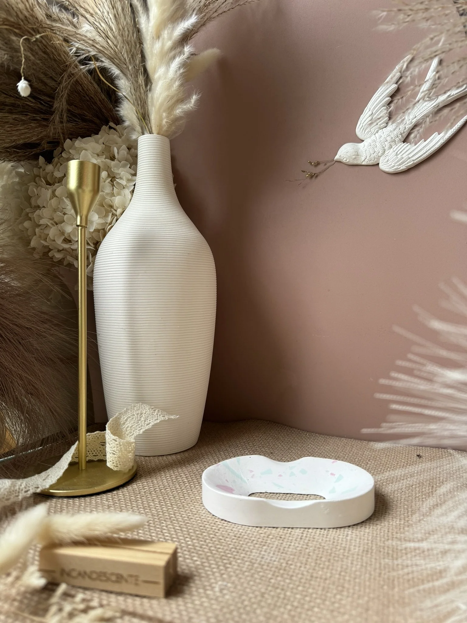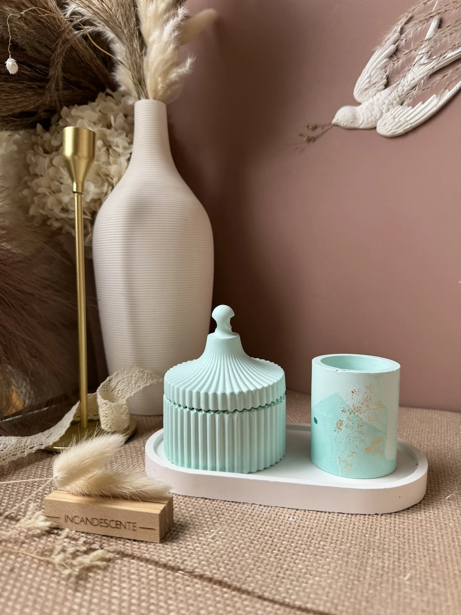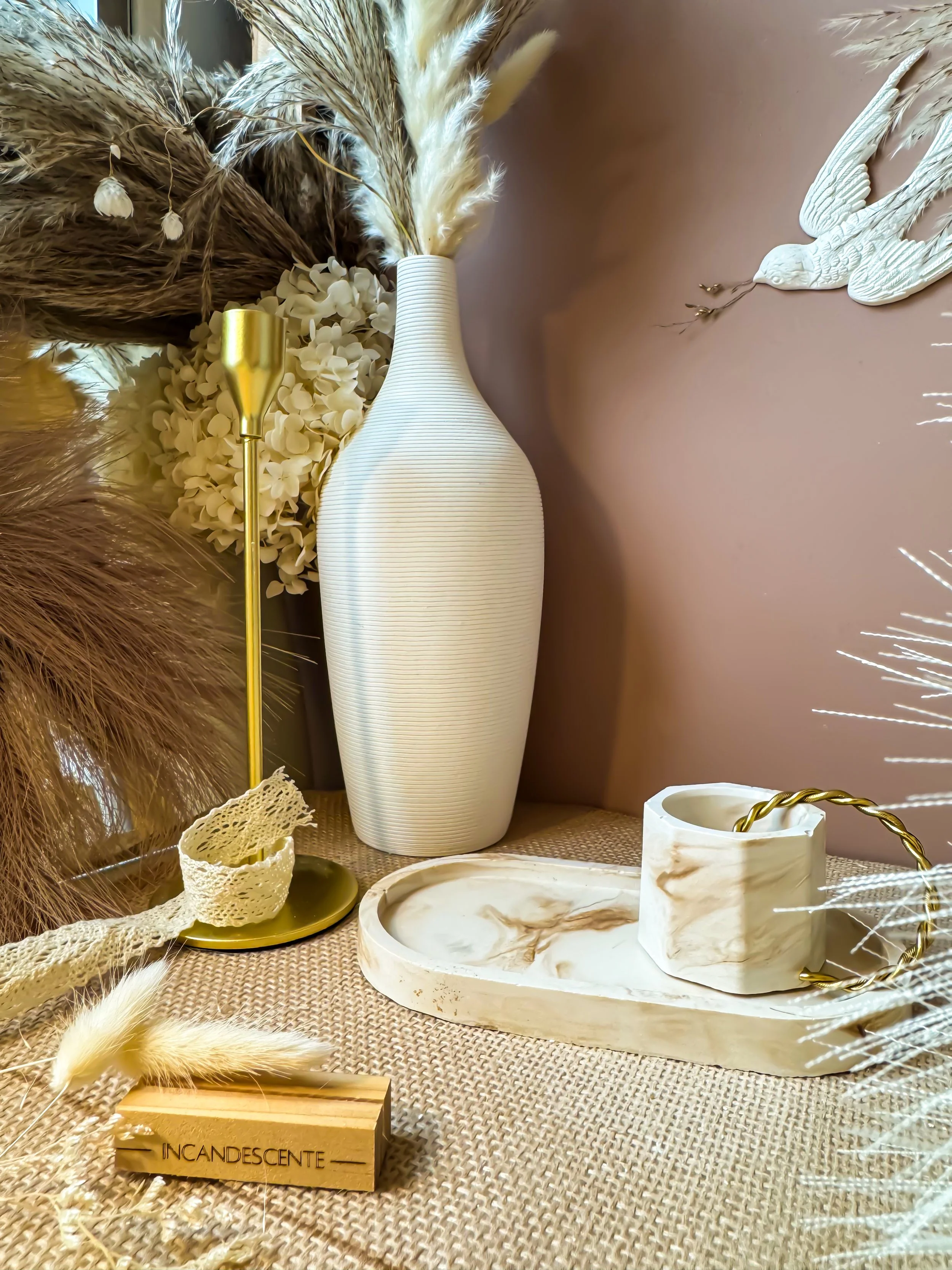 Plateau ovale marbré et son petit pot hexagonale en plâtre