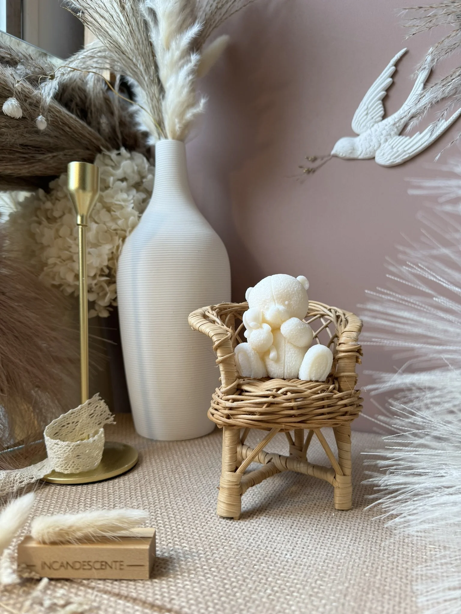 Apportez une touche à votre intérieur avec cet élégant décor en plâtre. Cette objet apportera la touche finale à votre décoration en laissant un voile parfumé. Coloris au choix. Dimension cm. Composition: cire